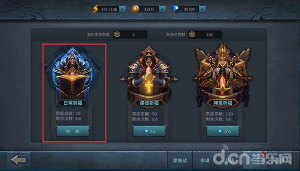 加入家族的玩家每天都可以进行家族祈福,可以使用金币和钻石进行祈福,每次祈福都会提高家族贡献度。