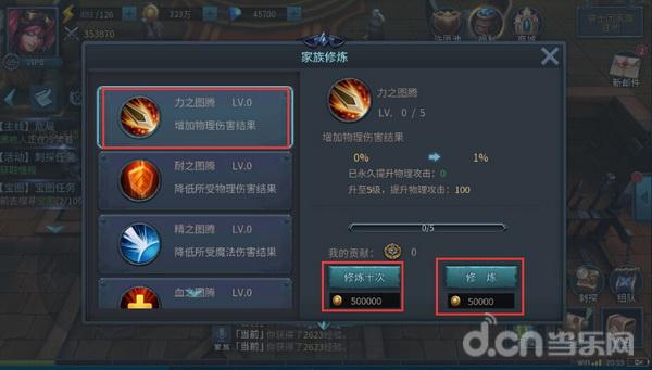 玩家通过消耗家族贡献度和金币提升个人的家族修炼图腾等级。