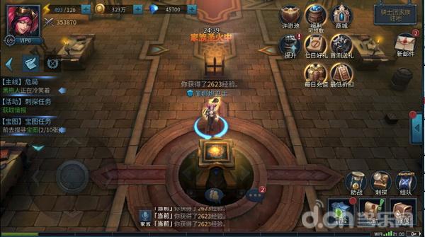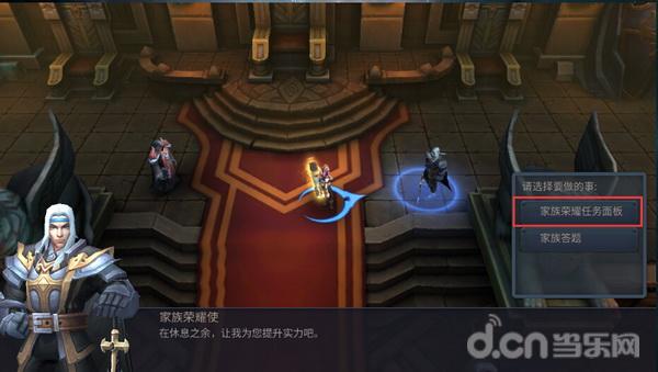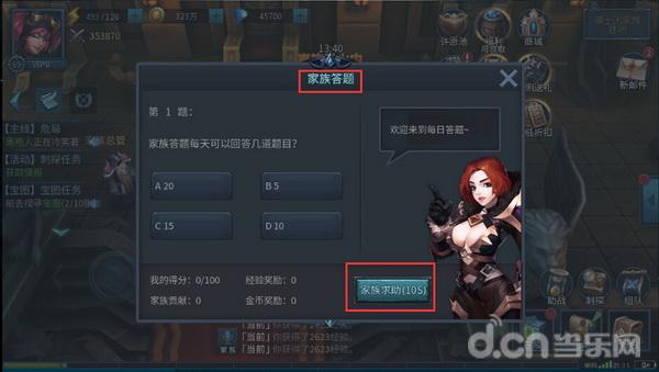 点击家族荣耀使NPC进行“家族答题”,题目为单选,答对题目可获得经验、家族贡献、金币等奖励,也可向家族成员求助。