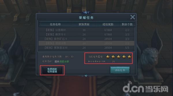 家族荣耀任务存在星级,星级越高获得的任务奖励就越高,每周有20次免费刷新星级的机会。