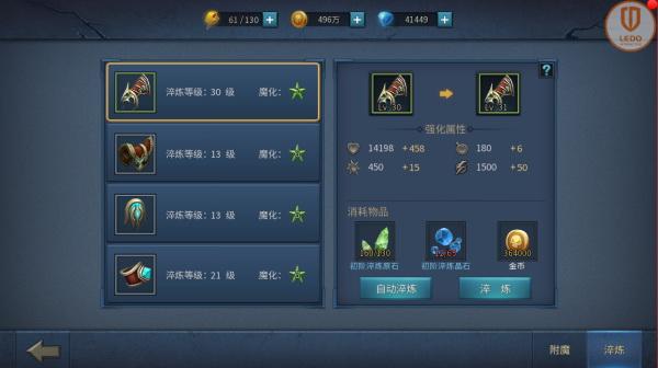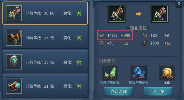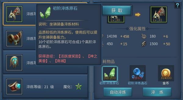 淬炼初始消耗材料为初阶淬炼原石、初阶淬炼晶石,当淬炼达到一定等级后则需消耗高阶淬炼原石、高阶淬炼晶石;目前可以从【活跃度奖励】【神之黄昏】【商城】三个途径获得。每淬炼一级,装备将获得固定数值的属性加成。