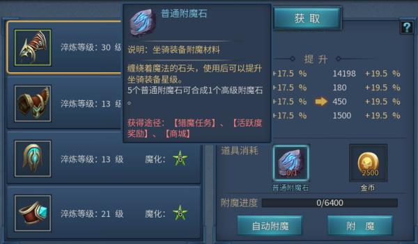 附魔初始消耗材料为普通附魔石,当附魔达到一定星级后则需消耗高级附魔石;目前可以从【猎魔任务】【活跃度奖励】【商城】三个途径获得。