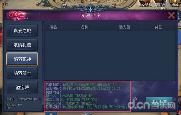 鹊羽花神榜、鹊羽骑士榜浪漫开启!!活动期间,收到鲜花的玩家可以参与鹊羽花神榜的排名,活动结束后将会根据排名获得不同的称谓!获奖玩家可以在8月10日21:05:00至8月17日23:59:59期间领取活动奖励!