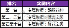 活动期间,向自己喜欢的玩家赠送鲜花,可以在鹊羽骑士榜上进行排名,活动结束后将会获得海量超值奖励!!获奖玩家可以在8月10日21:05:00至8月17日23:59:59期间领取活动奖励!