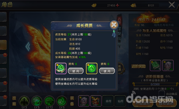 除了坐骑进阶,随着坐骑等阶的提升,玩家还可以使用资质丹和成长丹来增加坐骑的属性。资质丹可永久增加坐骑攻击、防御和生命三种属性,而成长丹则可以永久增加人物属性的0.8%。坐骑的资质丹和成长丹每个等阶可使用的数量都有限制,等阶越高,可使用的数量越多。