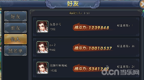 在好友系统里,还能记住仇人的名字,所谓仇人,就是近期把你打败的人,俗话说君子报仇十年不晚,这个功能让你清楚的记住把你打败的人,到时候提高战斗力,在某个PVP活动中复仇吧,在介绍好友系统的最后,还有一个黑名单,当你和某位侠客分道扬镳的时候,或者恩断义绝可以把他加入黑名单,加入黑名单会让双方的亲密度归零噢,如果双方和好了,虽然可以移除黑名单,但是需要重新加好友。