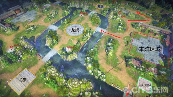 战场中间有3个龙旗,双方分别抢夺,抢夺后龙旗积分开始增加,达到一定数量后,在玩家出生点位置会自动召唤出木龙,供任意己方玩家操控,提升己方进攻防守能力。 最后一张为3D视角的地图说明。