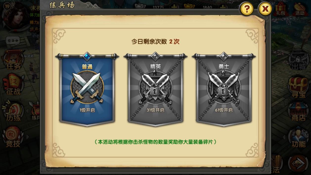 玩家每天可以参加2次练兵场活动,练兵场中可以获得大量武将经验。
