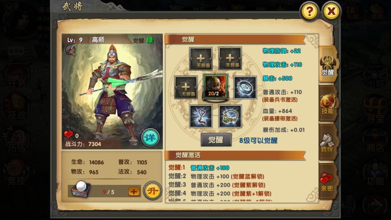 在游戏中玩家可以收集宝物对武将进行觉醒,觉醒会改变武将的颜色等级,增加武将的三维属性,还会开启对于觉醒等级的技能。