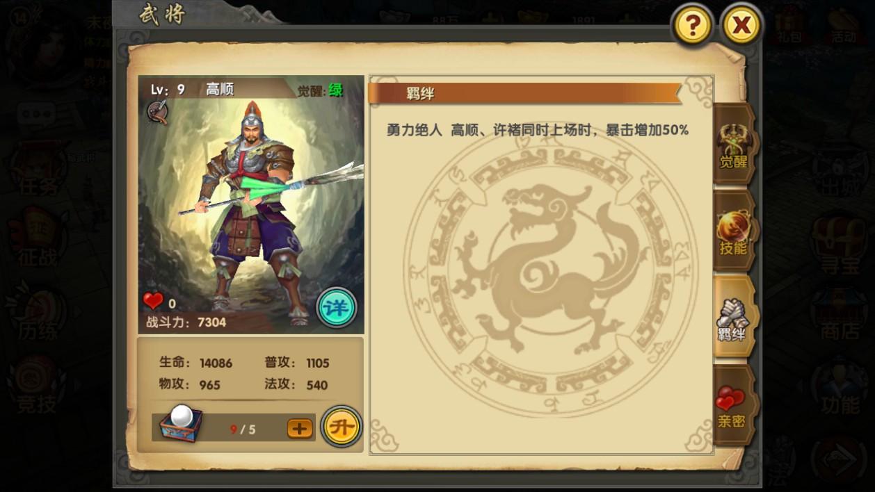 武将与玩家之间会有亲密值,玩家通过对武将赠送礼物来增加和武将的亲密值,当亲密值达到一定等级时,武将的属性会得到加成,变的更为强力。