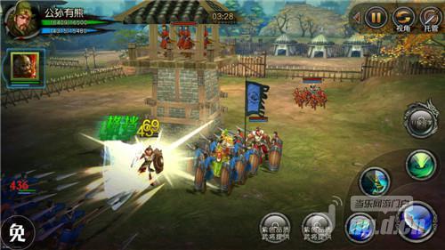 “A·SLG”是《关云长》手游的独创概念,可以切换的两种视角,给人以MOBA与无双式的双重体验,说到这里就不得不说游戏的操作方式与界面了。与以往的传统动作游戏一样,本作依然采用的虚拟按键的操作方式,由左边的虚拟摇杆控制方向,右下角则有7个按键,最大的是普攻键,按着不动也可使人物发出普攻连招,围绕它的三个小按键则代表三个技能键、旁边两个则是武将技能按键,上面的则是人物的无双技能。