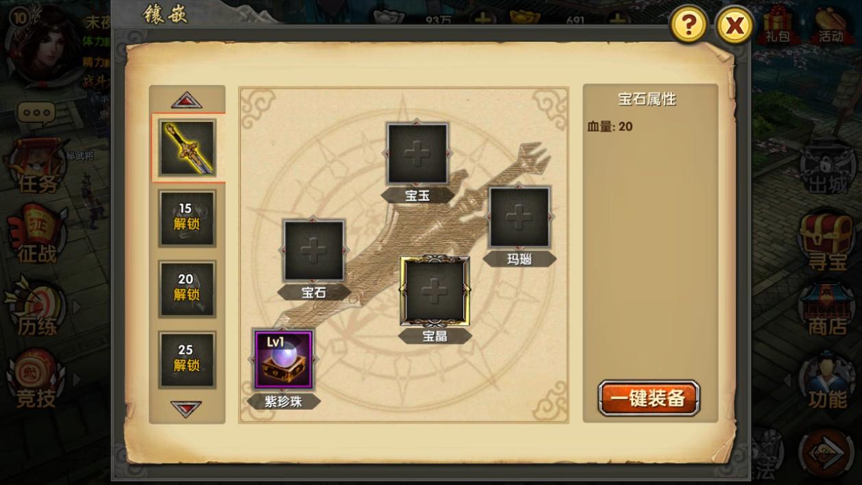 武将装备部位可以镶嵌宝石道具,每个部位可镶嵌5种宝石。宝石道具可以升级,升级后对应宝石的属性会得到提升。宝石道具有套装概念,单部位镶嵌的宝石达到某个套装数量后会得到额外的属性加成及更大的加成提高或获得新的技能。