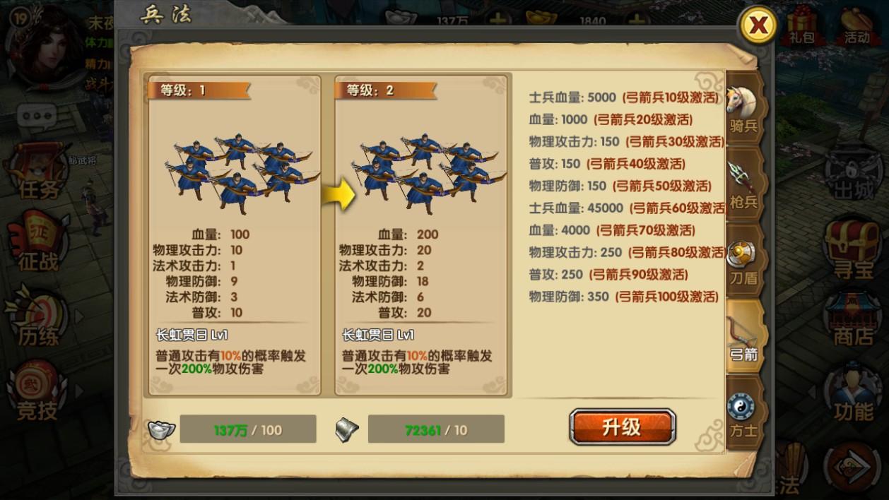 玩家可以通过兵法系统来提升士兵的等级,士兵等级提升后士兵的实力也会得到提升,当等级达到一定级别时,士兵的模型级颜色会相应改变。