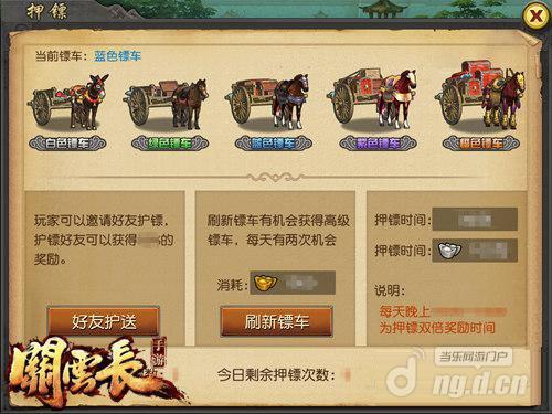 玩家可以对当前镖车不满意时可以选择“刷新镖车”,每次刷新将会随机更改变镖车型号,极有可能获得高级镖车。选择完运镖车,接下来就该邀请好友护镖了。但请记住,高利润往往意味着高风险,选择使用高品质镖车将有可能提高被其他玩家劫镖的机率,此时运镖利润也会大打折扣。