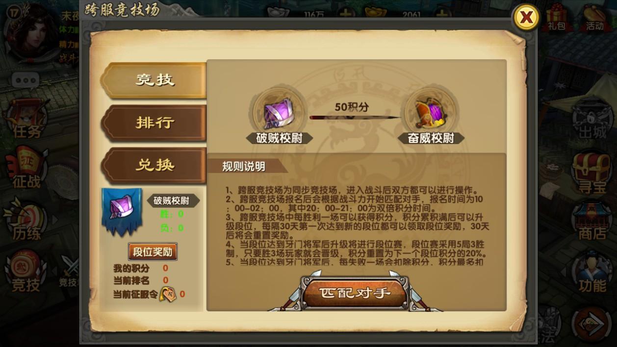 3、跨服竞技场中每胜利一场可以获得积分,积分累积满后可以升级段位,每隔30天第一次达到新的段位都可以领取段位奖励,30天后将会重置奖励。
