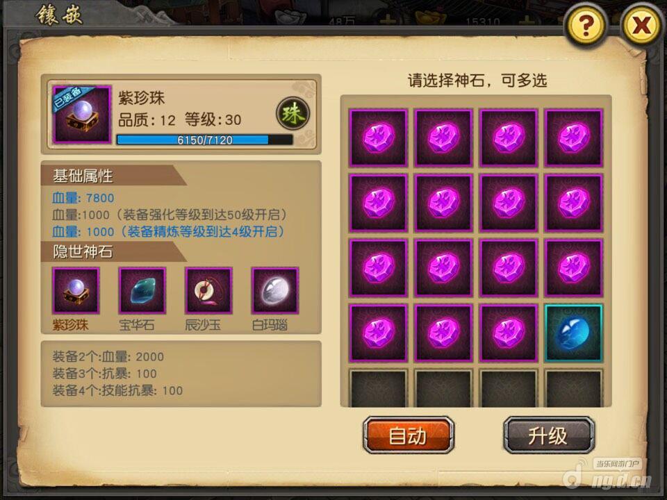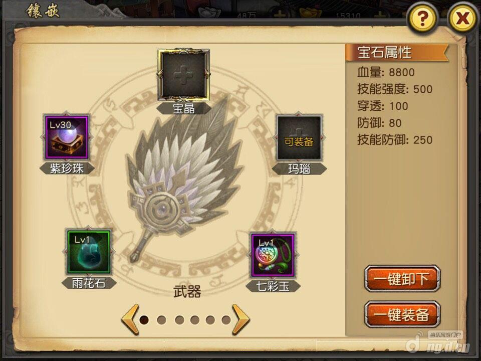 武将装备部位可以镶嵌宝石道具,每个部位可镶嵌5种宝石。宝石道具可以升级,升级后对应宝石的属性会得到提升。宝石道具有套装概念,单部位镶嵌的宝石达到某个套装数量后会得到额外的属性加成及更大的加成提高或获得新的技能。