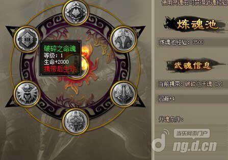 每个武将都有灵魂、魔魂、斗魂、天魂、幽魂、命魂这六种武魂。所相对应的是增加武将的物理暴击、技能暴击、抗暴、闪避、精度、生命。每个武将只能携带1种武魂。炼魂池内的经验可提升武魂等级,使用灵魂石才能增加炼魂池经验。重置武将武魂时可取回所有的炼魂经验。