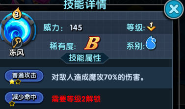 主动技能:冻风--对敌人造成魔攻70%的伤害并降低对方的命中