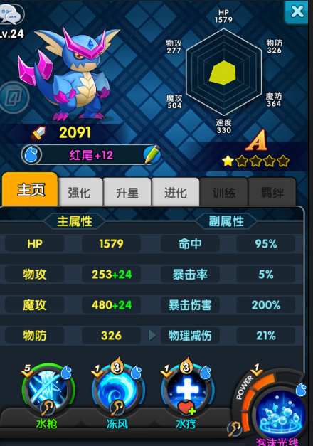 当它进阶为水蓝兽是有几率让水枪进阶为冰枪(对敌人造成魔70%的伤害并对冰冻目标必定造成暴击。