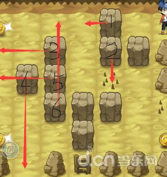 首先把石头1向左推一格,接着把下边的石头2往下推到刺那里,之后把左边的石头3一直推,推到墙边;然后把下边的石头4也推到墙边。捡完金币后回到中间,把左边的石头5推到墙边,最后把石头6推到墙边。