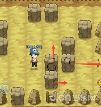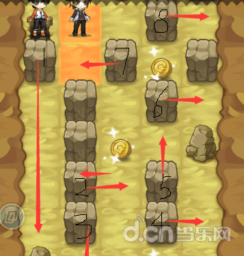 接下来变成下图这样子就简单多了,把石头7往右边推一格,再把石头8向上推一格,之后把石头9推到刺那里就好了,捡完金币就可以进下个房间了。