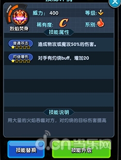 稀有度是C级,属于火系技能,一阶威力是四百。技能属性是:普通攻击,造成物攻或者魔攻50%的伤害。灼烧增伤,对手有灼烧buff,增加20。