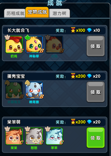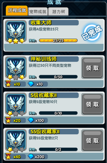 成就分为历程成就、宠物成就两种,历程成就以在游戏中的行为内容为主,宠物成就则是以收集的宠物信息为主,满足不同训练师进行挑战。