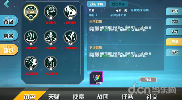 通过游戏界面左上角可以进入“角色-魂石”界面。这个界面可以看到每种武器的详细魂石描述和开启等级,以及进行魂石升级和魂石装备。