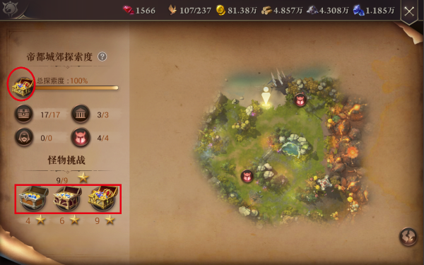 除了本身丰厚的回报,随着“总探索度”的提高,还有3个宝箱奖励!可千万小瞧这些路边的矿产和野怪,系统给的奖励可是不少!对于主城和英雄的发育来说,弥足轻重!当完成度达到100%,还会获赠500个钻石!