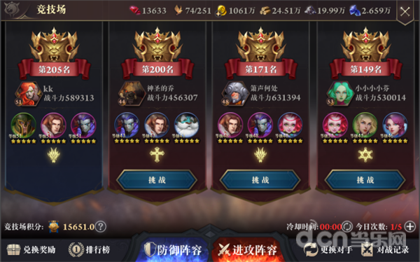 竞技场是游戏内一个异步PVP的玩法,玩家可以上去和同等水平的玩家进行切磋。玩法比较简单,只需要布置好阵容,点击挑战后,英雄和兵种将会自行战斗。而每一个排名名次,都会有相应的积分奖励,用于兑换商品!