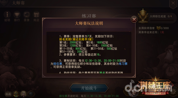 大师赛为赛季制,一个完整的赛季为7天,赛季结束后,排名第一的玩家可获得2000红钻奖励,其余前100的玩家也能获得数量不等的红钻奖赏。