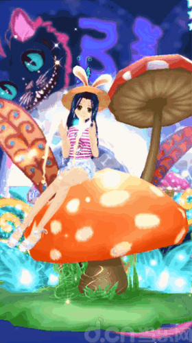 衣饰清单:神奇蘑菇坐骑+爱丽丝头饰+阿拉丁女发+柴郡猫女T恤+爱丽丝背景。