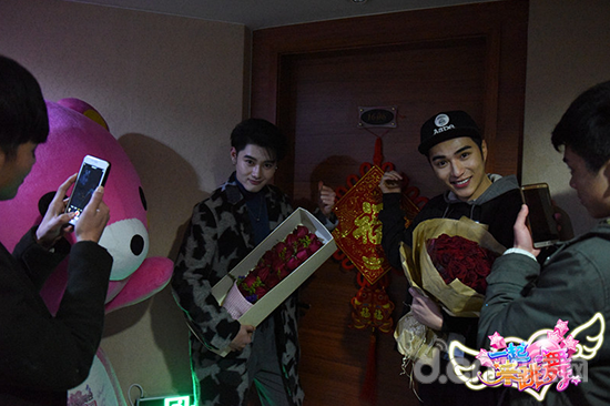 两位帅哥手捧玫瑰,敲响了幸运玩家的门