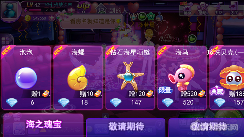 其次在更新后即将推出“礼物赠送系统”。大家在房间中等待舞蹈开始的同时,与其静静的等待房主开始游戏,无聊的发几句牢骚,现在有了更多选择。在房间内,大家可以向自己心仪的TA,赠送礼物,大声表白啦!点击房间内心仪的对象的人物,选择“送礼”,就可以购买礼品送出。用最直接的礼物来表达你的心意,让我们一起大胆说出“我爱你”!