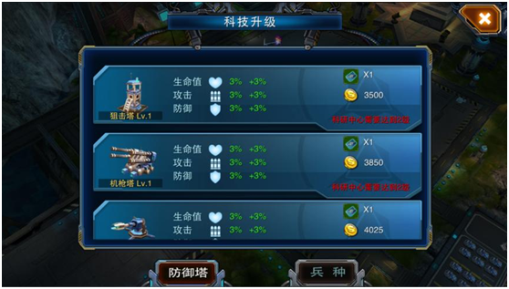 3) 科技属性加成:科技研发成功后,增加相应建筑、兵种、技能的属性。