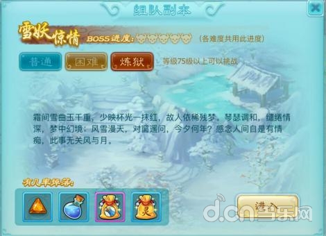 霜间雪曲玉千重,少映杯光一抹红,故人依稀残梦。在《仙剑奇侠传3D回合》中,雪妖惊情的剧情饱受玩家们喜爱,随着玩家战力的提升,普通模式、困难模式的雪妖惊情副本已经满足不了他们了,今日更新后,新增炼狱难度,等级达到75级的玩家们可每日组队通关副本一次,细品雪妖剧情,获取丰厚战斗奖励,宝石、灵气袋、坐骑灵水奖等你来挑战。