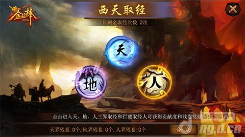 西天取经的入口位于仙盟内,40级开启。取经的地点分为天、地、人三界,经书有绿色、蓝色、橙色和紫色4种品质,对应不同额度的贡献度奖励。每人每天有2次取经的机会,在12-14点、18-20点2个特定的时间段取经会有额外的收益加成!