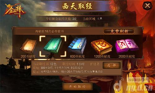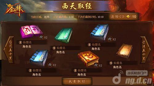 取经,顾名思义就是得到经书、获得书中的真(jiang)理(li)。但是想得到奖励并不容易,取得经书后有1个小时的考验时间,你会遭受到来自各方豪杰的觊觎,被拦截的话可是会让贡献度奖励减少的哦。