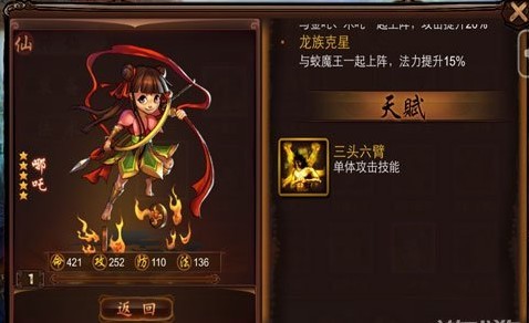 天赋技能四星神技三头六臂:单体攻击技能,对目标本身造成大量伤害。