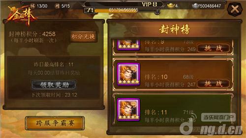 每月第一个周一为跨服争霸赛的固定开启日期。跨服争霸赛的入口位于封神榜界面的左下角,每个服封神榜前100名的玩家可参与。跨服赛开始后,将根据相应的规则将若干个不同服务器的玩家划分至一个战区内,根据战斗实力匹配可挑战的对手,进行王者间的PK对决。