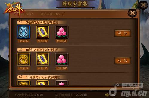 跨服擂台中必然会有这样的高手,捷报连连、战无不胜!当玩家在跨服赛中连胜达到一定的次数,不仅会有全服的走马灯昭告天下,更有珍贵的奖励:元宝、蟠桃、银绸乾坤袋、金丝乾坤袋、乾坤符箓等。连胜越多,奖励越丰厚。