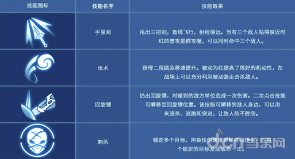 手里剑(普攻):甩出三把剑,直线飞行,射程很远,点击即可释放。当有三个敌人站得很近时,红的普攻是群攻喔,可以同时命中三个敌人。