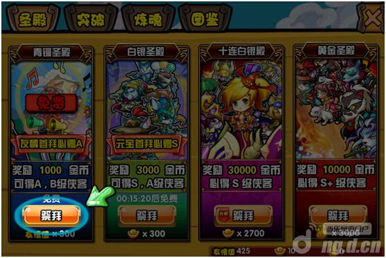 几场简单的战斗过后,等级就升至8级此时将能够同时上阵两个侠客,圣殿也同时开启,每人将有一次免费青铜圣殿祭拜和一次免费白银圣殿祭拜,运气好的话免费能够抽到S级侠客的哦!~如果没抽到也不用灰心,测试期间赠送的元宝足够你抽到S级侠客的,放手去抽吧!搞到S级侠客之后,训练完毕就让他开始为你战斗吧!(普通训练即可,普通训练获得经验已经能够使侠客升至当前能达到的最高等级无需再浪费元宝)。PS:如果人品不尽如人意的话,重新建个号也是个不错的选择。