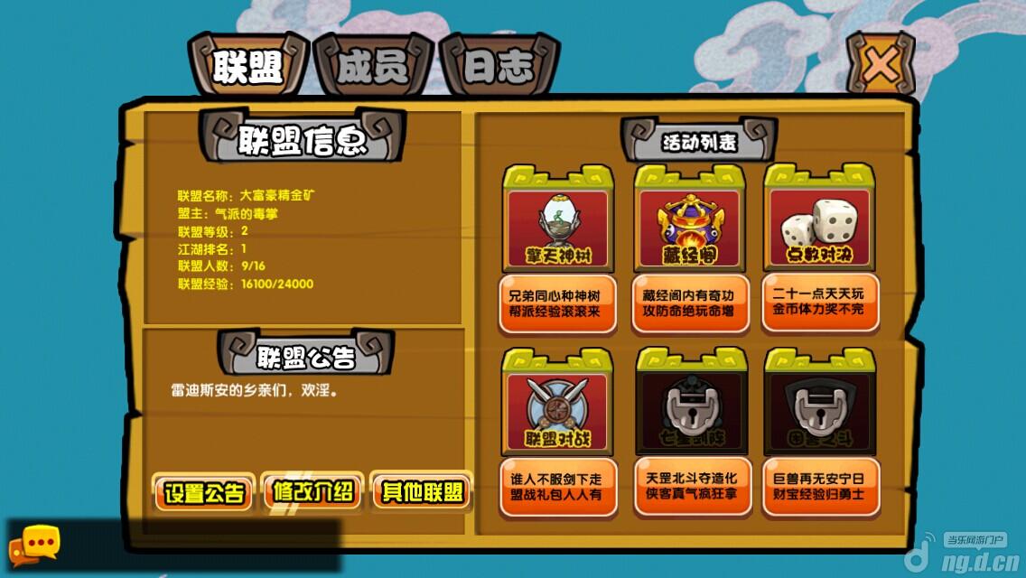 联盟藏经阁:玩家可以消耗帮派贡献提升绝学,为全部上阵侠客提供属性加成。