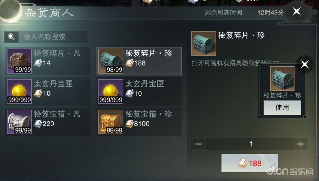 如图,秘籍碎片·珍,打开就有机会获得稀有金色秘籍碎片,需要188点秘籍点数·珍兑换,秘籍点数·珍通过回收高级秘籍/秘籍碎片获得。