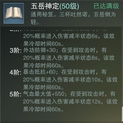 被攻击时有几率进入伤害减半状态持续N秒! 满级的五岳神定 伤害减半持续12秒!