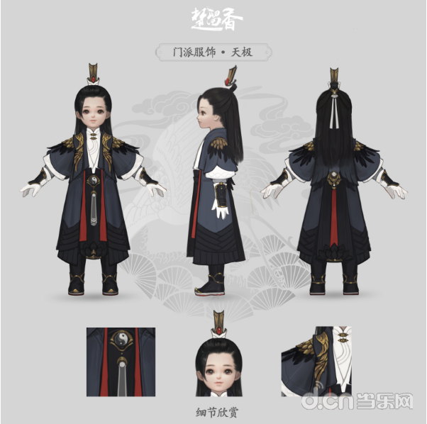 不同于师兄们的款式,小道长“天极”套装的衣襟间与后腰缀有红色带子,配色上更为活泼明朗,小改黑金主色的沉重。佩戴上镶有红珠的高束发冠,更贴近孩童的天真气质。