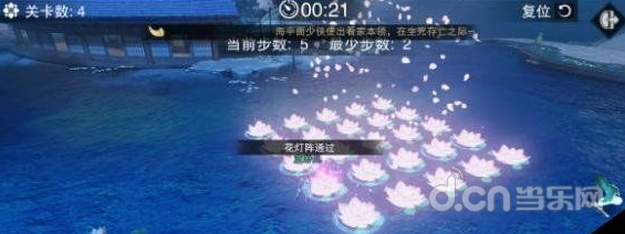 如上图,最小步数为两步,其实就是两个十字组成,可以找只有一个花灯亮的行列,图中可以看到有两个,两个亮着的花灯的交点就是我们要跳的目标花灯。如这张图中的花灯阵,可以先原地调一下,再调整好镜头的位置,向前跳跃即可,等到了目标花灯的上方,松开方向键,人物落下去就站在花灯上了。