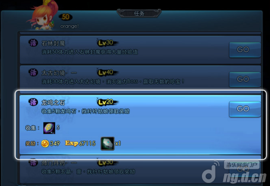 在我们达到20级是就可以领取支线任务-龙门客栈,完成该任务后就开启了“龙鸣之石”任务了,任务都在酒馆老板npc-苏纤纤处领取,任务是需要收集5块龙鸣石,提交后即可获得大量经验还有强化石哦,强化石可以用来加护装备。