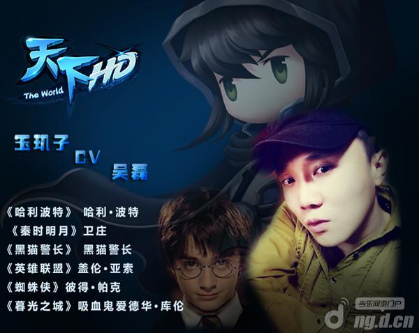 《哈利·波特》中创造奇迹的魔法师哈利波特,《暮光之城》男主角爱德华·库伦,《古剑奇谭2》深沉的王者沈夜,《秦时明月》中狂傲的反派卫庄……吴磊的声音磁性迷人,不仅在许多脍炙人口的大片中担纲主角,近年来也多次受邀为著名动漫、游戏的重要男性角色配音,堪称“男神专业户”。“天下”系列游戏中,玉玑子大人一直是一个传奇而争议的人物,此次吴磊的《天下HD》玉玑子配音在BOSS的邪魅狂狷外多了一丝温情,用富有魅力的声音完美的演绎玉玑子的多面性格,为玩家再一次呈现一个与众不同的大荒男神形象。